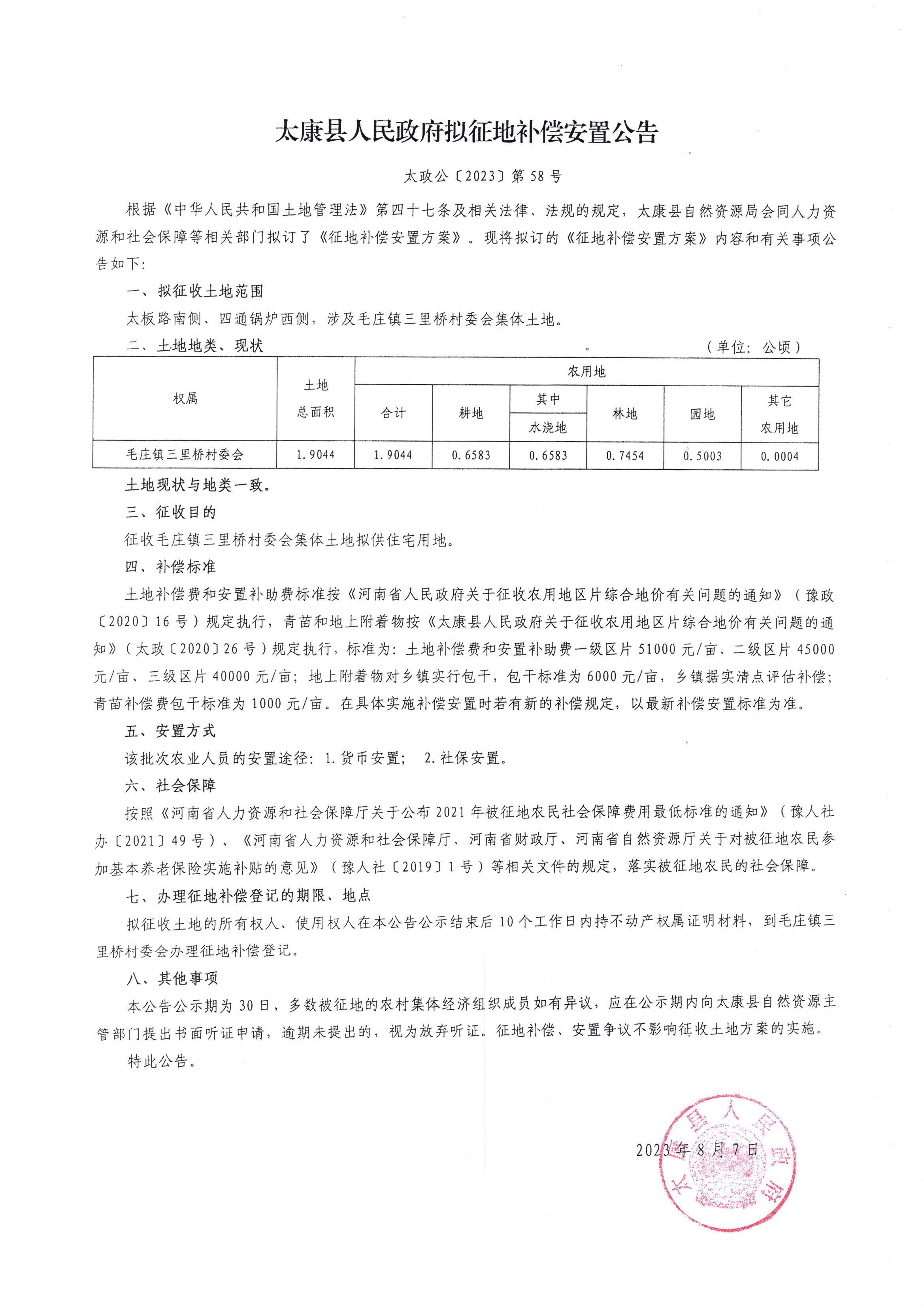 太康县人民政府拟征地补偿安置公告