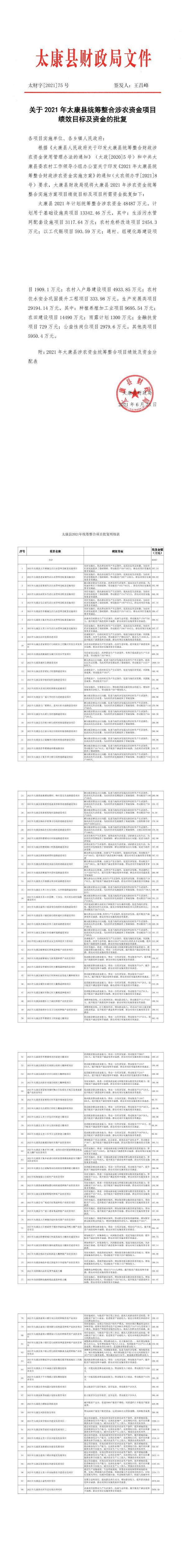 关于2021年太康县统筹整合涉农资金项目绩效目标及资金的批复