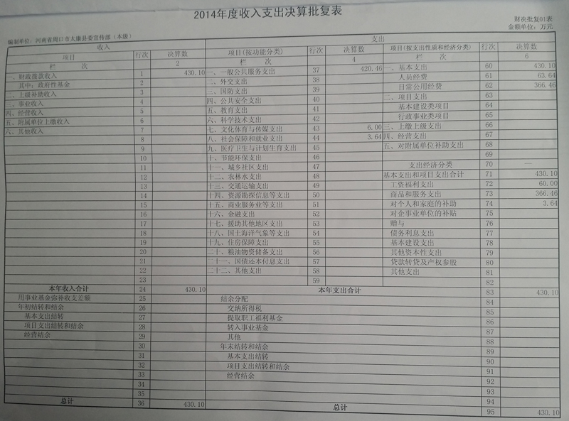 2014年度收入总计430.1万元,全部收入为财政拨款;2014年度支出总计为430.1万元。