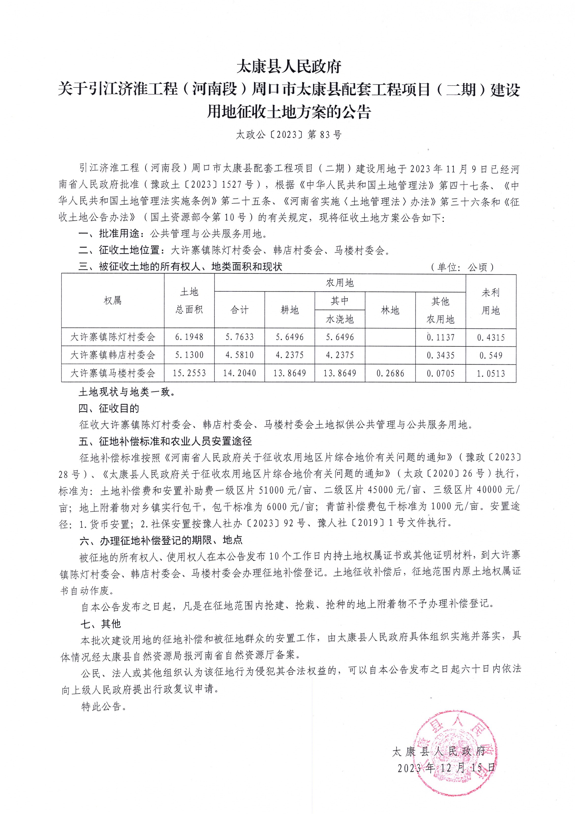 关于引江济淮工程(河南段)周口市太康县配套工程项目(二期)建设用地征收土地方案的公告